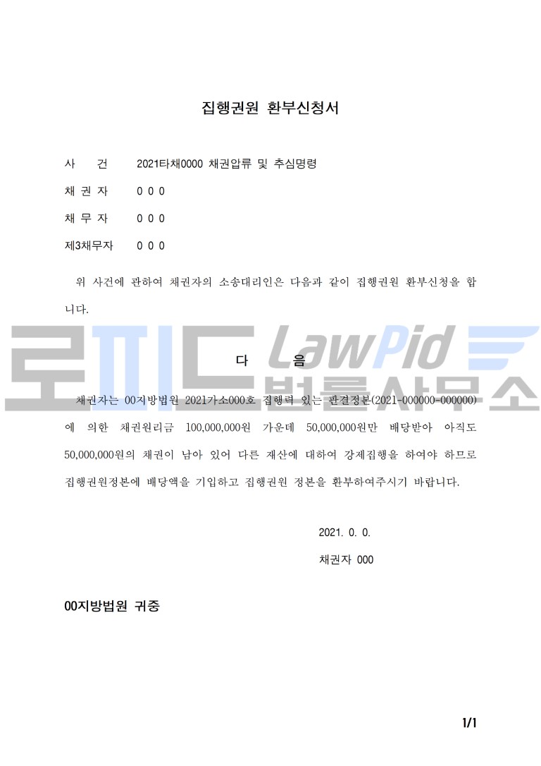 강제집행 절차가 진행되어 채무자의 재산을 채권자에게 배당하게 되면 집행절차가 종료되는데, 법원은 채권자의 환부신청에 따라 집행권원을 되돌려줍니다. 만약 하나도 배당받은 것이 없다면 원본 그대로 되돌려주고, 일부를 배당받은 경우에는 집행력 있는 정본에 배당받은 액수를 적어서 돌려줍니다.