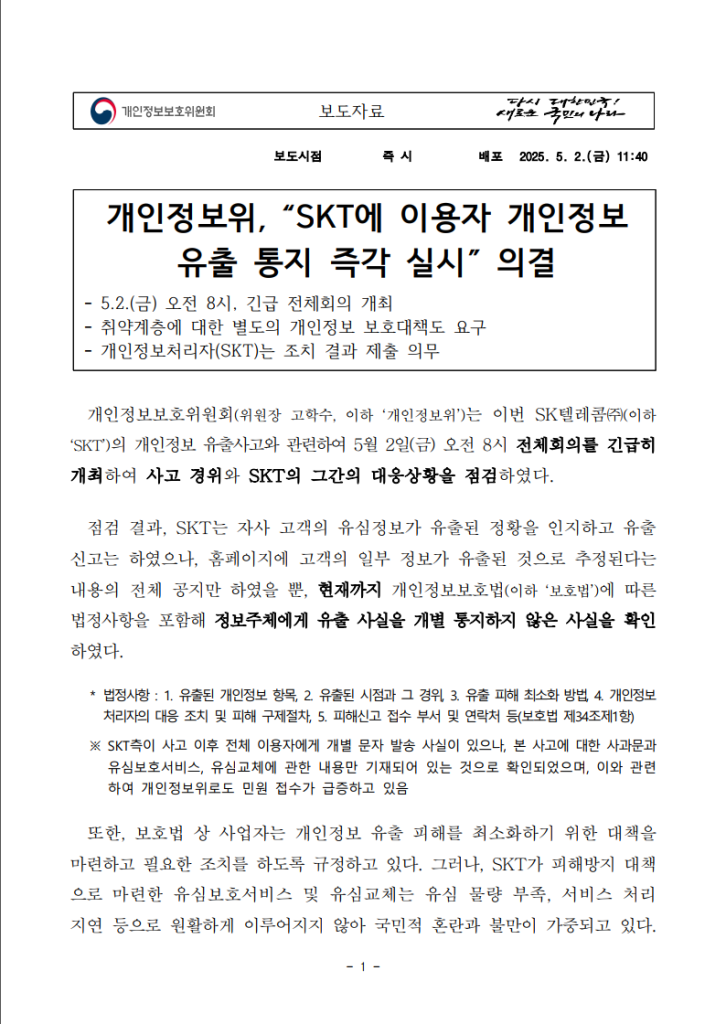 이에 개인정보위는 SKT에 유출이 확인되거나 가능성이 있는 모든 이용자(알뜰폰 포함)에게 즉시 법정 사항을 갖춰 통지하라고 강력히 요구했습니다. 이는 법에서 정한 '지체 없는 개별 통지' 원칙이 단순한 권고사항이 아니라 반드시 지켜야 할 강행 규정임을 다시 한번 확인시켜 줍니다.