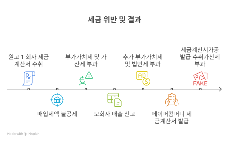 원고 모회사들 (원고 2, 3 회사 - 라면스프, 포장박스 공급업체): 페이퍼컴퍼니의 매출로 신고된 부분을 실제 사업자인 원고 모회사들의 매출로 보아 부가가치세 및 법인세를 추가로 부과받았습니다. 또한, 페이퍼컴퍼니가 거래처로부터 물품을 공급받은 것처럼 꾸며진 세금계산서(이 사건 ② 세금계산서)의 매입세액은 불공제되었죠. (피고 원주세무서장)