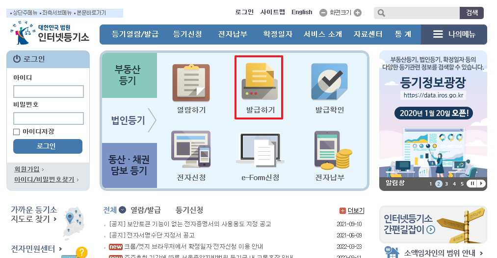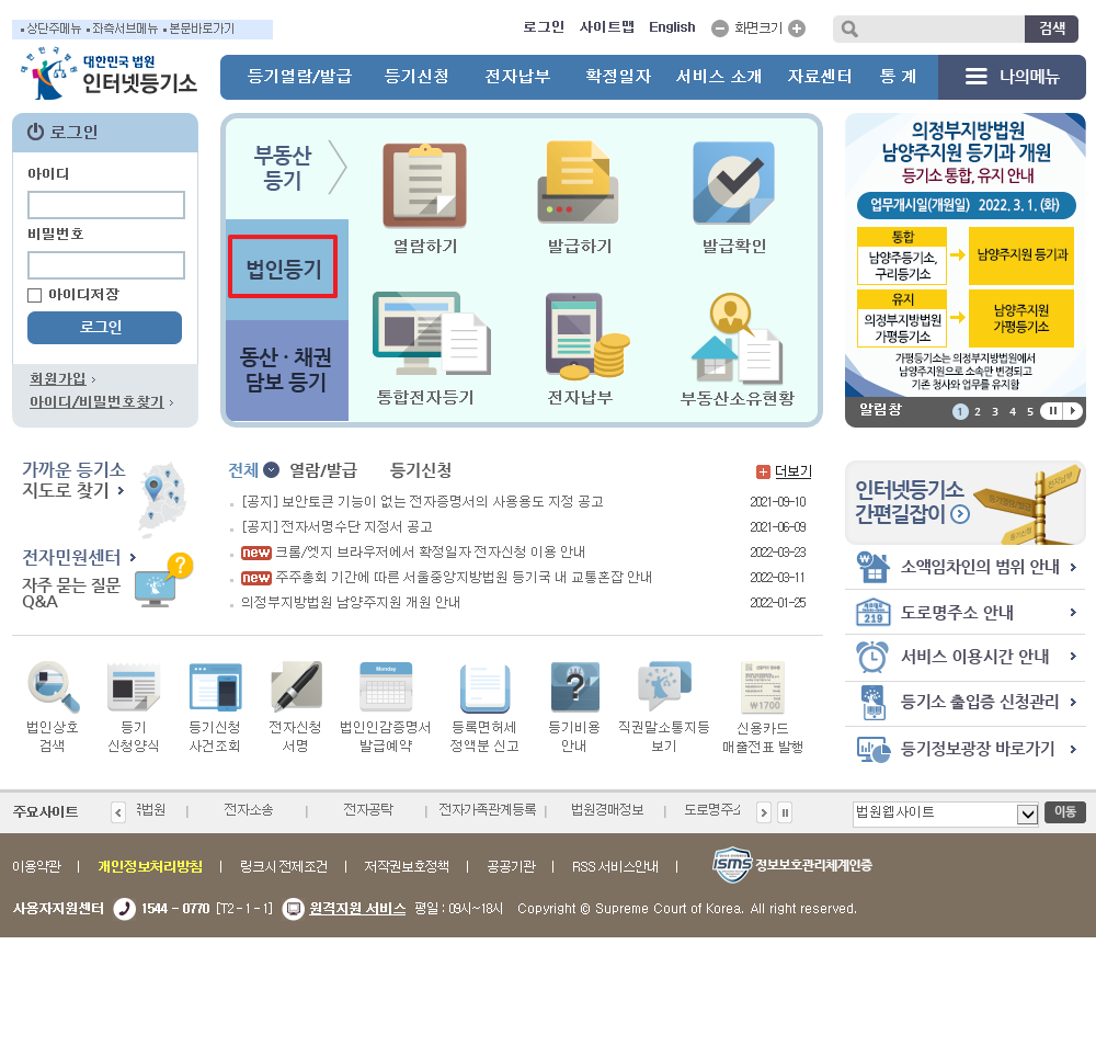 먼저 인터넷 등기소 홈페이지에 접속합니다.