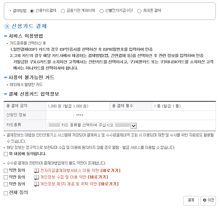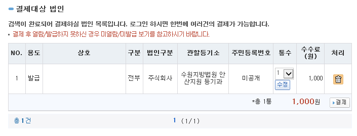 이후 발급수수료 결제단계를 진행합니다. 법인등기사항증명서의 발급수수료는 1통당 1천원입니다.