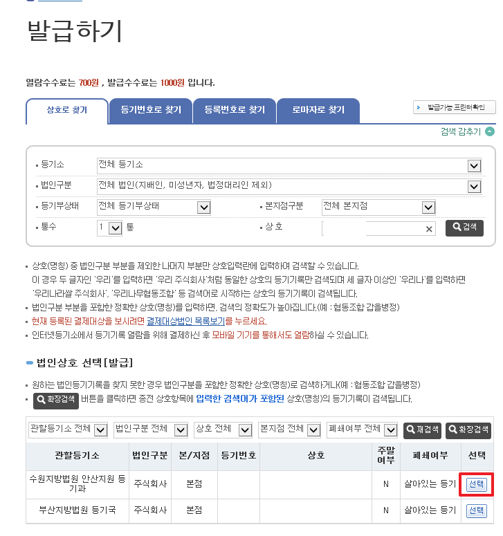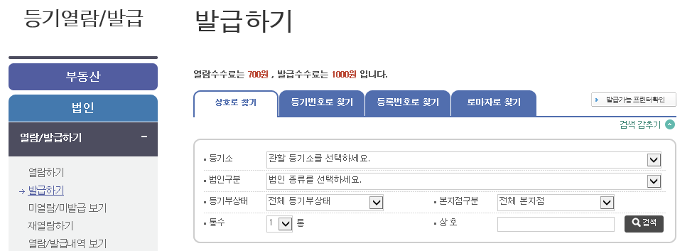 발급하기 메뉴에서 [등기소], [법인구분] 등을 선택하고 상호를 입력합니다.