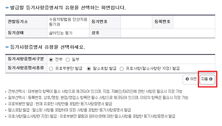 원하는 등기사항증명서의 구분 및 종류를 선택한 후 다음을 클릭합니다. 일반적으로 [전부], [말소포함발급]으로 하면 됩니다. 현행 등기사항만을 원한다면 [유효부분만 발급]을 선택합니다.