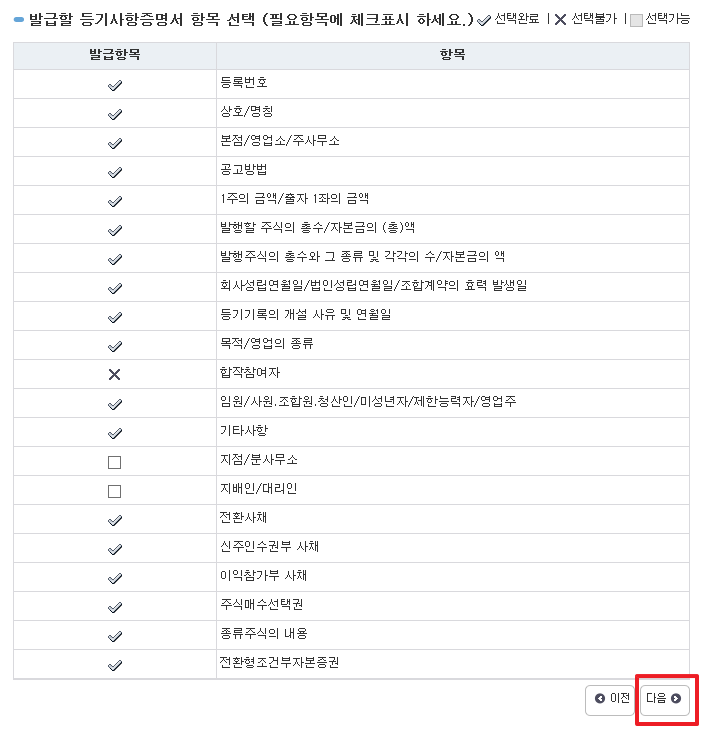발급할 등기사항증명서 항목의 경우 지점 또는 분사무소, 지배인 또는 대리인이 있는 경우 선택합니다. 이외의 경우에는 바로 [다음]을 클릭하면 됩니다.