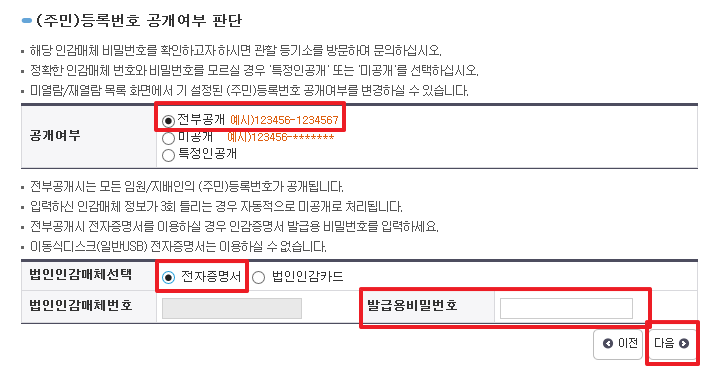 주민등록번호 공개여부 항목에서는 [전부공개], 법인인감매체선택에서는 [전자증명서], 발급용비밀번호에는 사전에 알고 있는 비밀번호를 입력합니다.