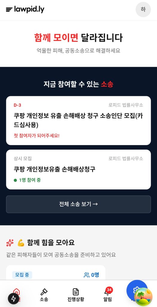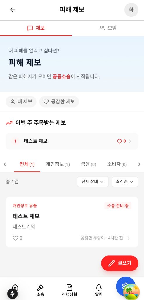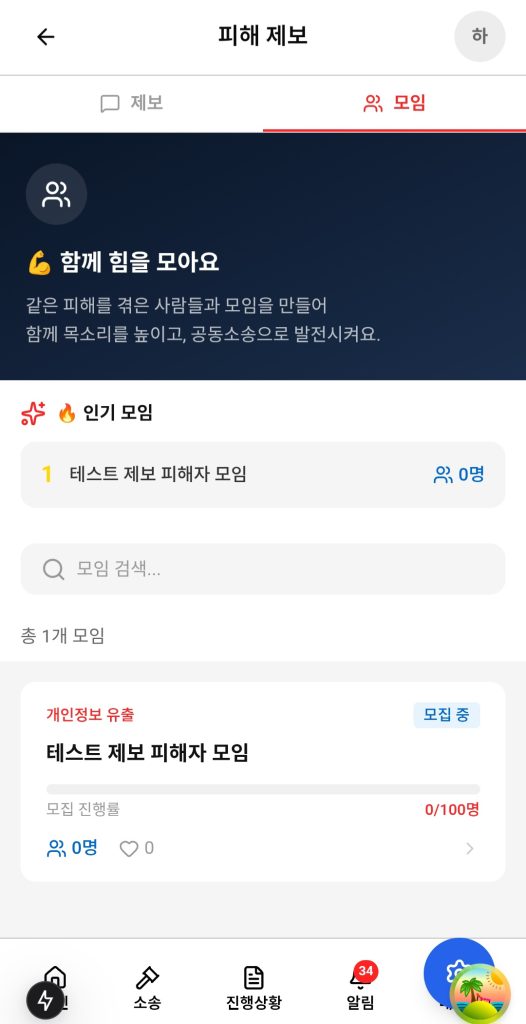 ■ 핵심 기능: “내 피해도 소송이 될 수 있을까?”… 피해 제보와 모임 개설