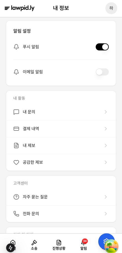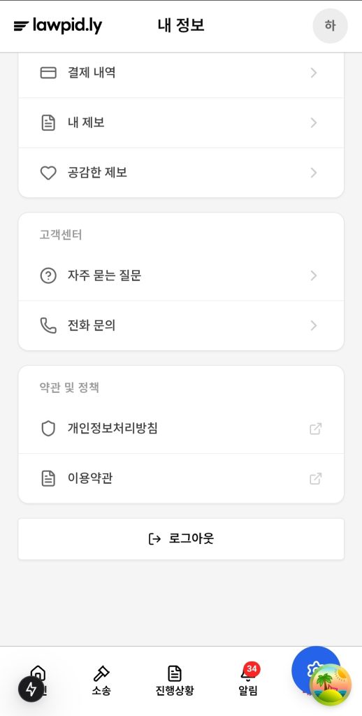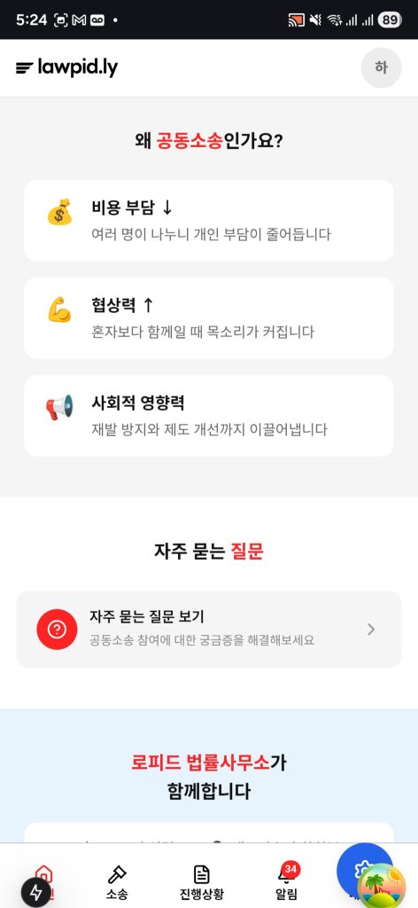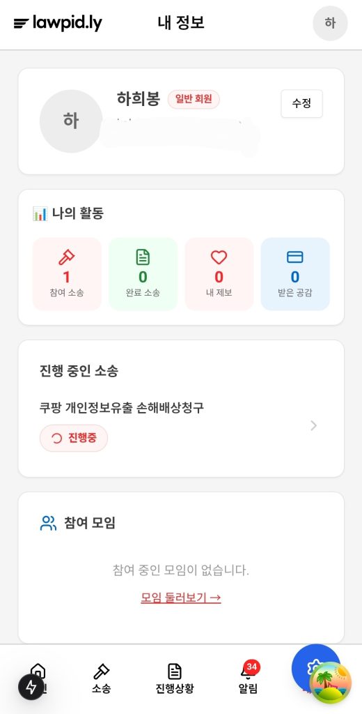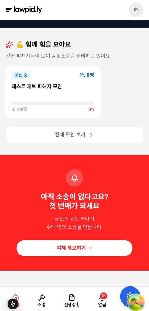 - 메인 화면: 진행 중인 소송 목록, 모임 현황, 피해제보 바로가기