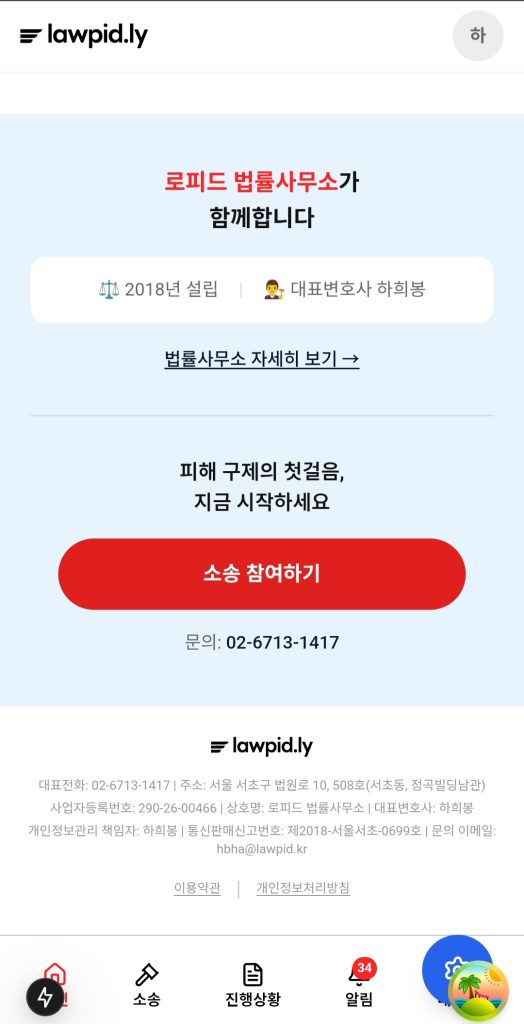 항목내용서비스명lawpid.ly (로피들리)웹사이트https://lawpid.ly서비스 유형공동(집단)소송 전문 플랫폼주요 기능피해제보, 모임, 공동소송 참여, 실시간 진행현황 확인운영로피드 법률사무소문의hbha@lawpid.kr