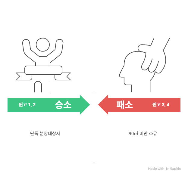 제2심 법원의 판단: "상속개시일 기준! 일부 원고는 단독 분양 가능!" (원고 1, 2 승소 / 원고 3, 4 패소)