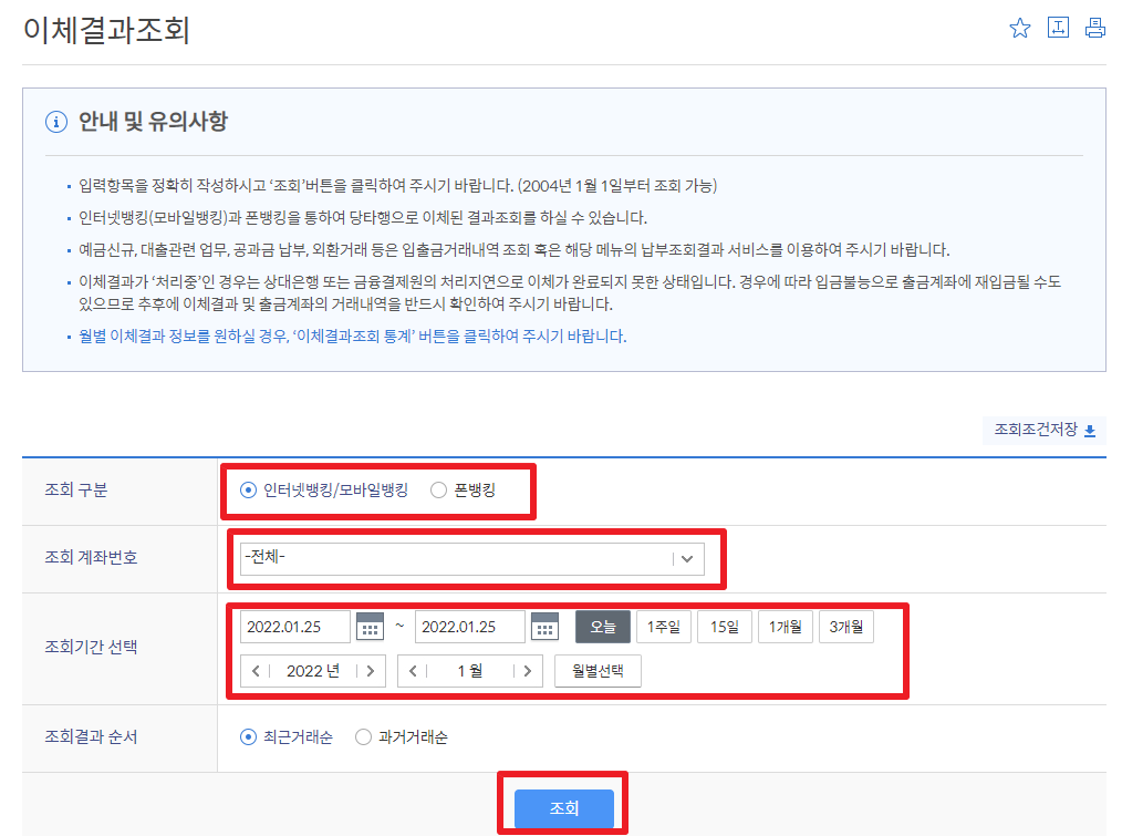 조회할 거래내용을 확인하여 설정하고 [조회]를 클릭합니다.