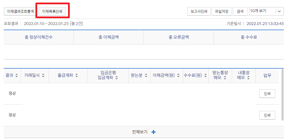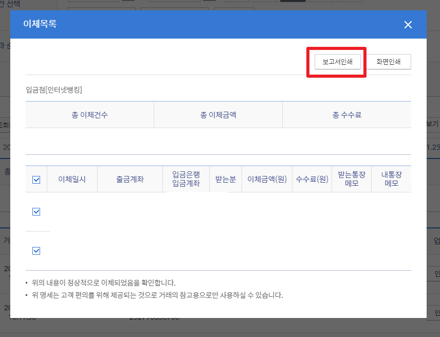 조회할 거래내역을 확인하였으면 [이체목록인쇄]를 클릭합니다.