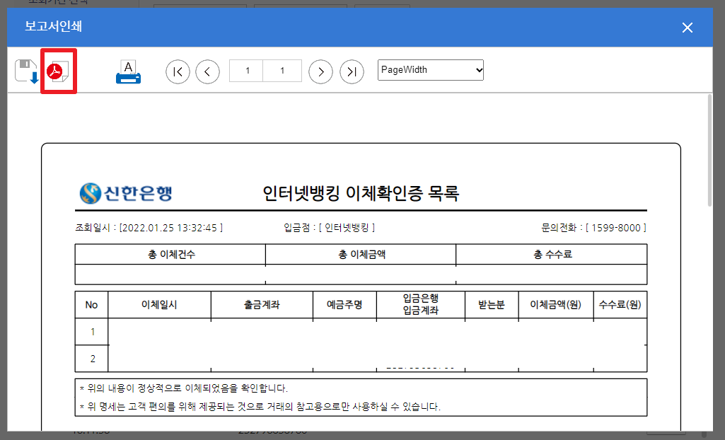 상단의 PDF 파일 아이콘을 클릭하면 이체확인증 PDF 파일이 자동으로 PC에 저장됩니다.