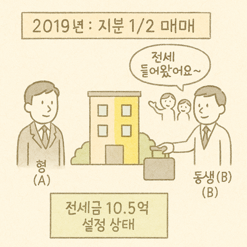 한편, 동생 B는 빚을 지기 전인 2019년 7월, 자신의 형(피고 A)으로부터 형이 소유하던 건물(이 사건 건물)의 1/2 지분을 매수하는 계약을 체결하고 소유권 이전 등기까지 마칩니다.