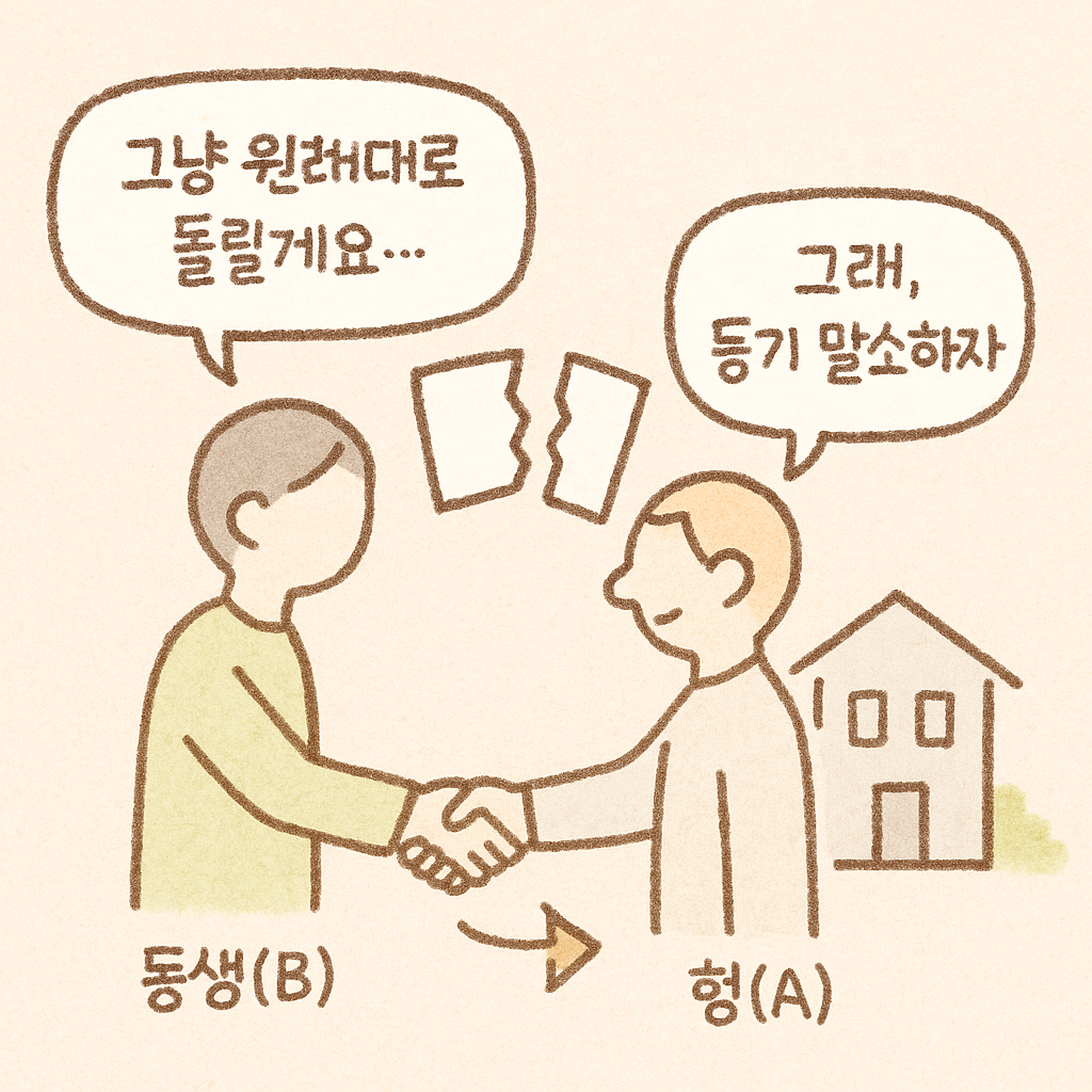 시간이 흘러 2020년 2월, 동생 B는 건보공단의 거액 환수 처분 등으로 인해 사실상 빚이 재산보다 많은 채무초과 상태에 빠지게 됩니다. 😨 바로 이 시점에, 동생 B는 형 A와 과거에 체결했던 건물 1/2 지분 매매계약을 '합의로 해제(합의해제)'하기로 하고, 자신의 명의로 되어 있던 소유권 이전 등기를 말소하여 건물 지분 소유권을 다시 형 A에게 돌려놓습니다.