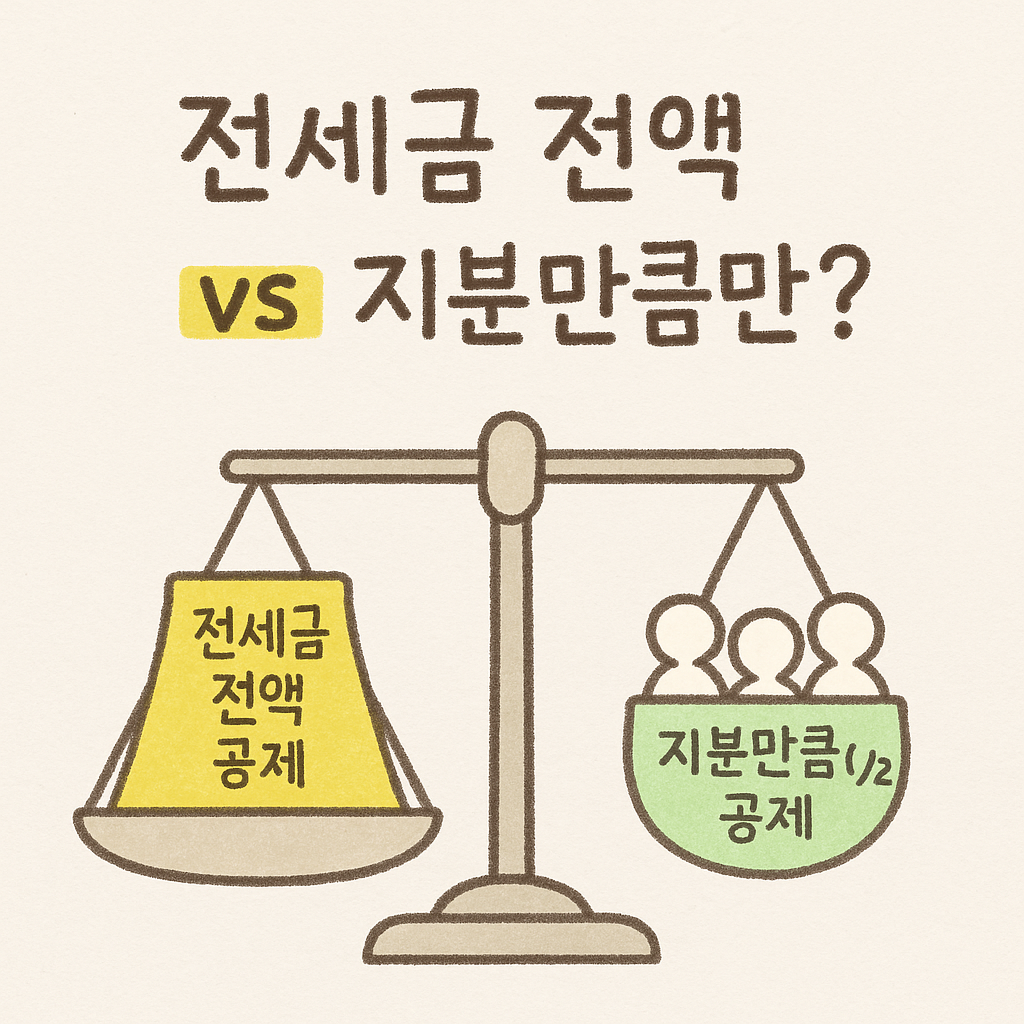 법원의 고민: 전세보증금 전액을 동생 B 지분 가치에서 공제해야 할까? 아니면 동생 B의 지분 비율(1/2)만큼만 공제해야 할까? ❓