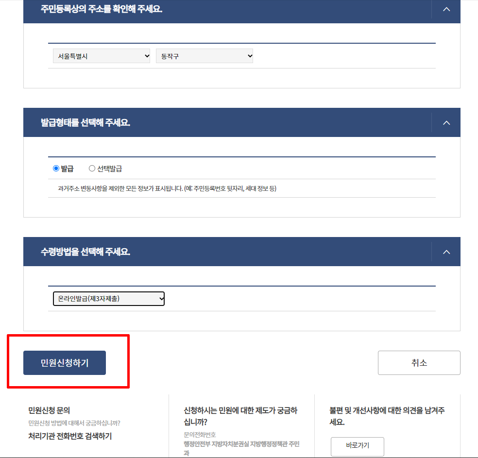 창이 닫힌 후 [민원신청하기]를 클릭하면 주민등록초본이 원하는 사람에게 전송됩니다.