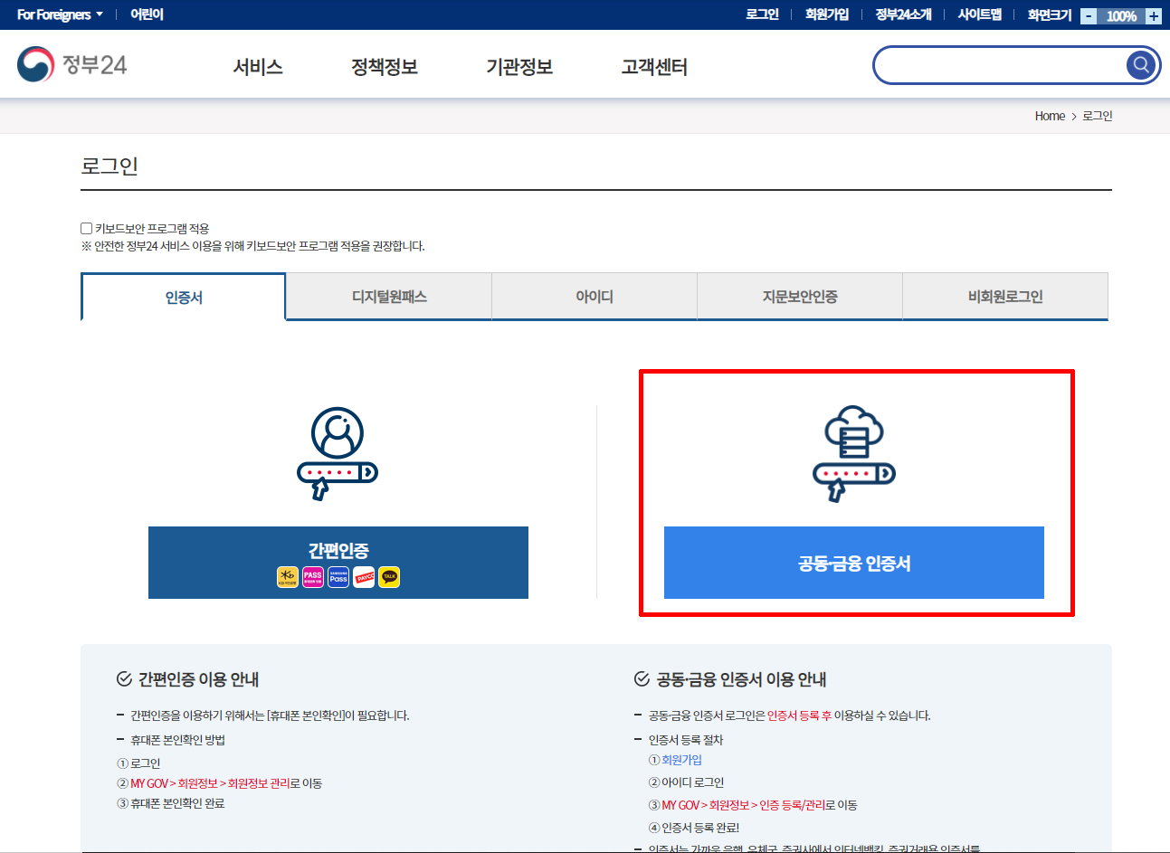 공동 인증서로 로그인합니다.