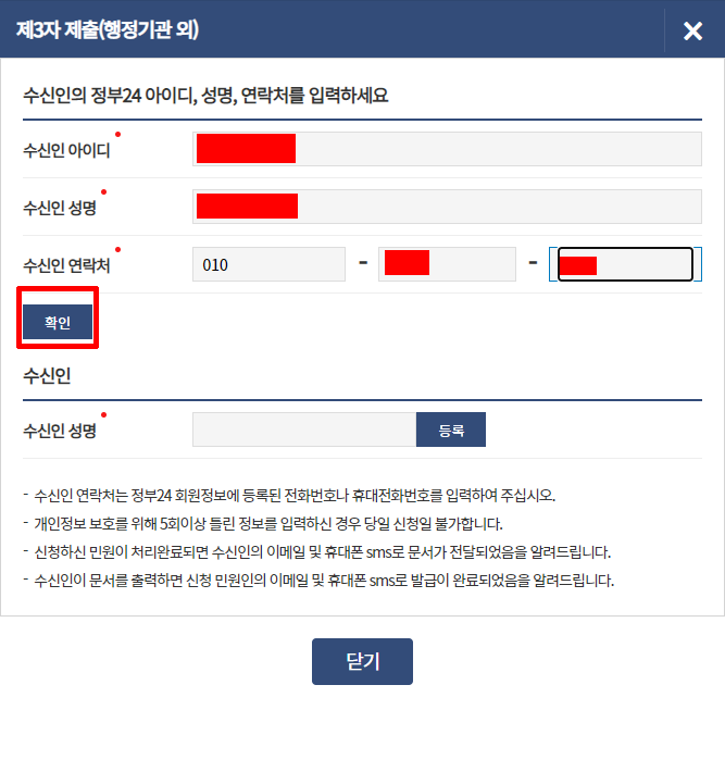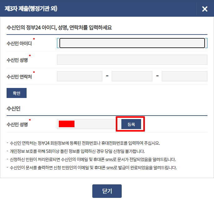 확인을 누르면 수신인 성명이 뜨는데 이때 창을 닫지 말고 [등록]을 눌러야 합니다.