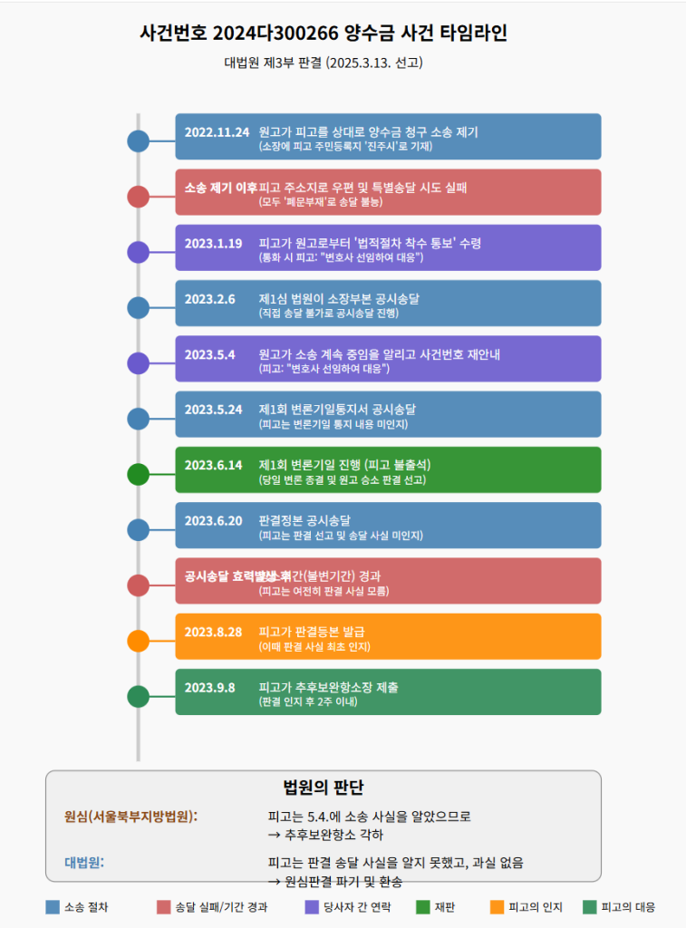 최근 대법원 판례(2024다300266 양수금)를 통해 추후보완항소의 요건을 좀 더 자세히 살펴보겠습니다. 이 사건은 공시송달로 인해 판결 사실을 뒤늦게 알게 된 피고가 추후보완항소를 제기한 경우입니다.