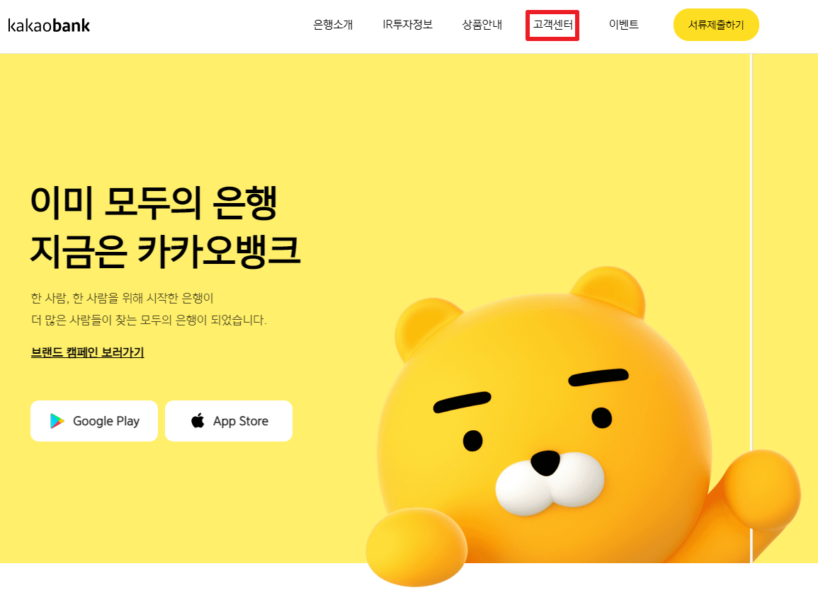 이제 PC에서 브라우저로 카카오뱅크 웹페이지에 접속합니다. 주소는 https://www.kakaobank.com/ 입니다. 메인페이지에서 우상단의 [고객센터]에 마우스 커서를 올려놓습니다.