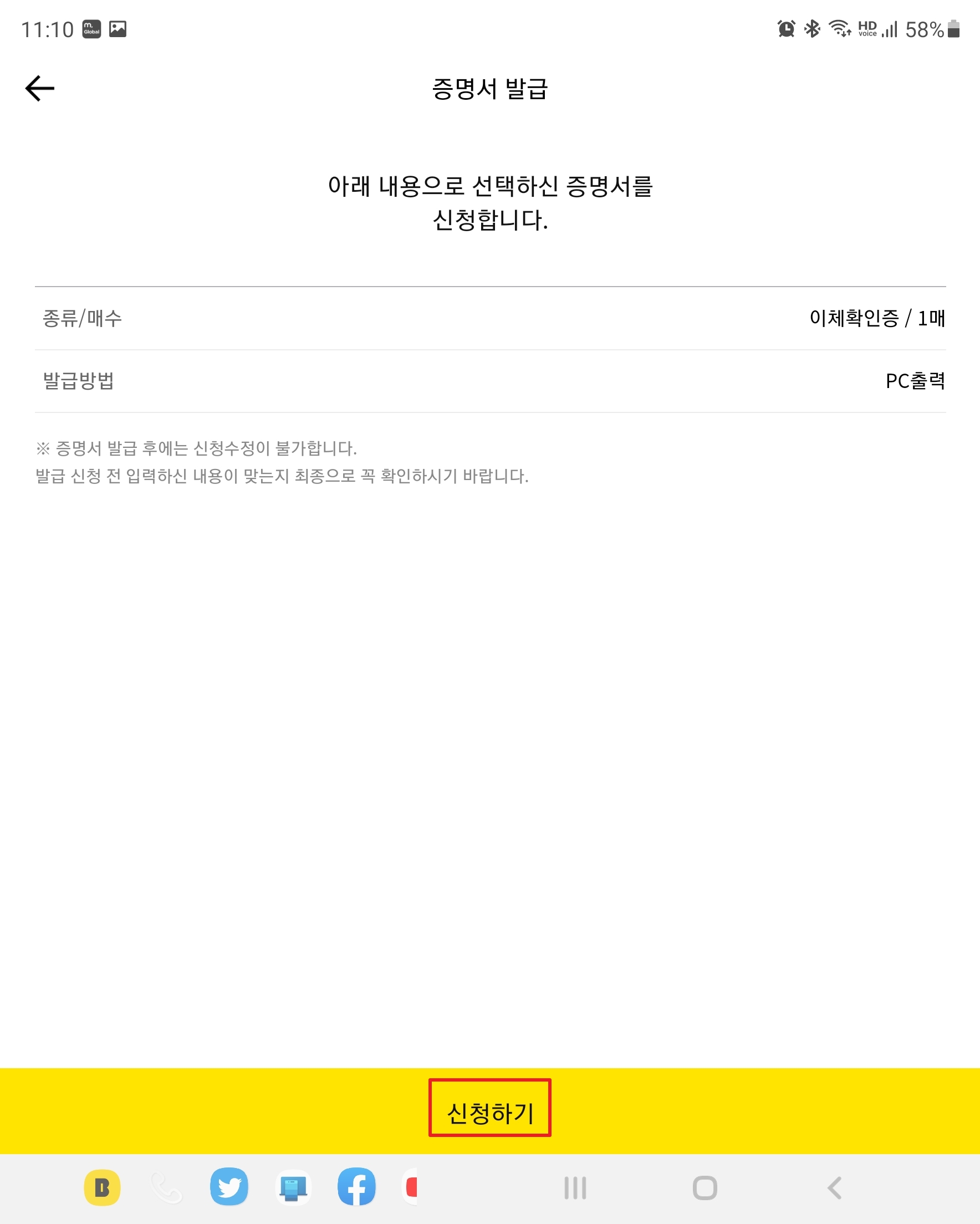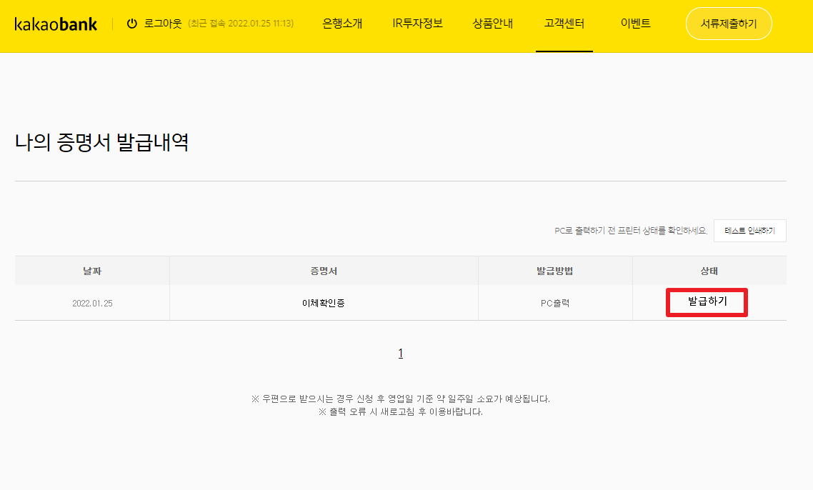 [발급하기]를 클릭합니다. 출력은 한 번만 가능하므로 발급 전에 프린터가 정상적으로 작동하는지 확인하시기 바랍니다.