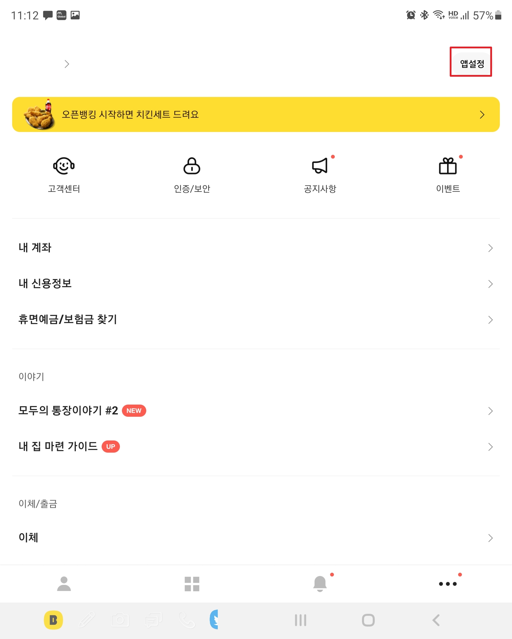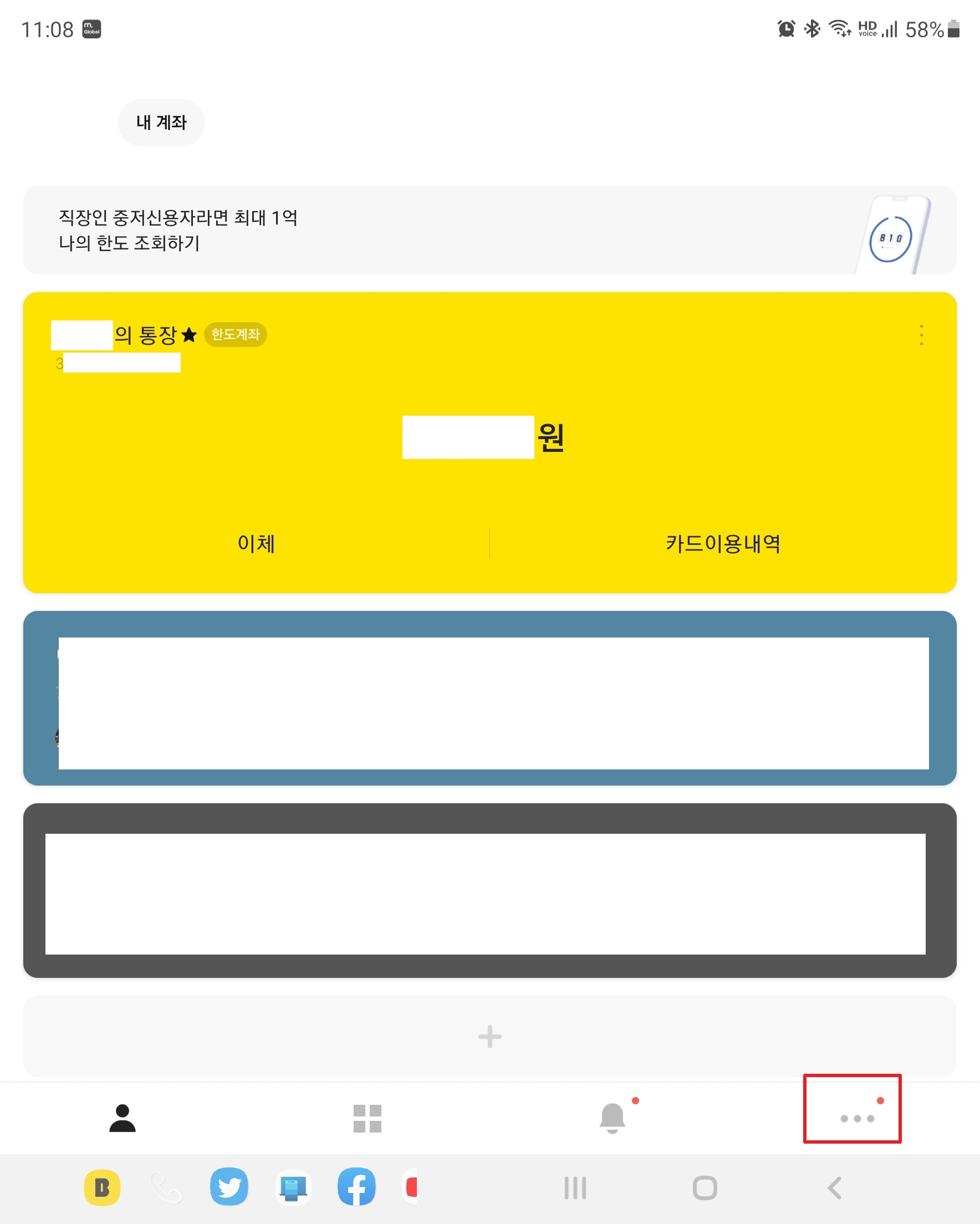 먼저 카카오뱅크 앱을 열고 첫 화면에서 우하단의 [...]을 누릅니다.