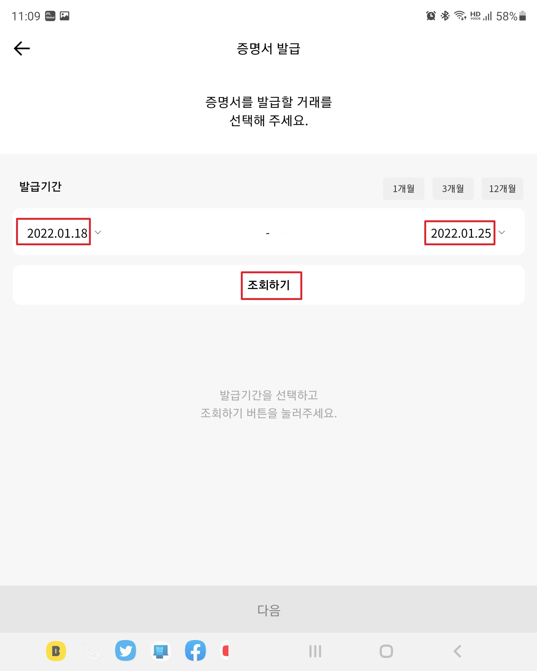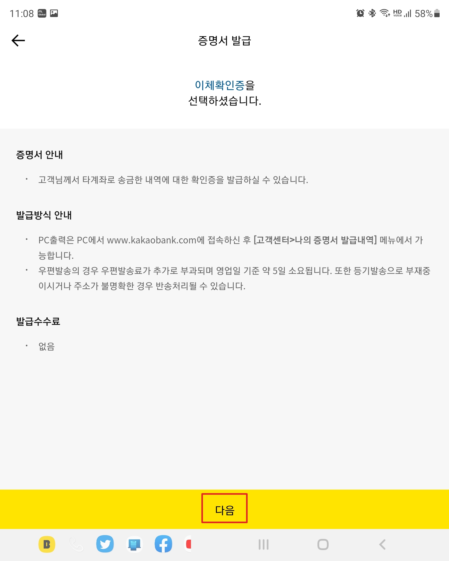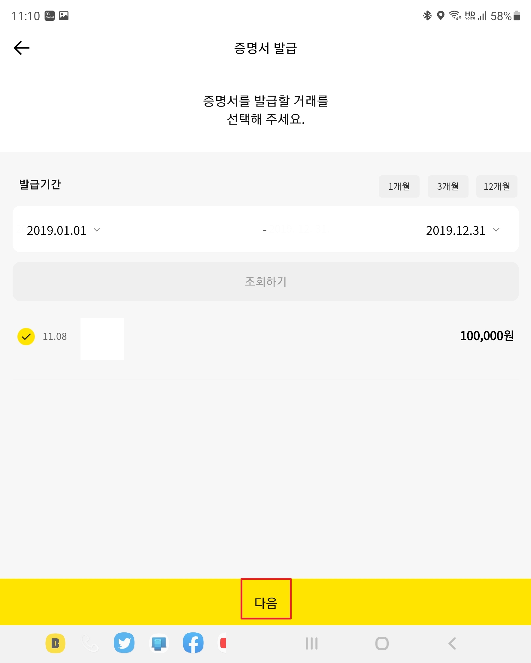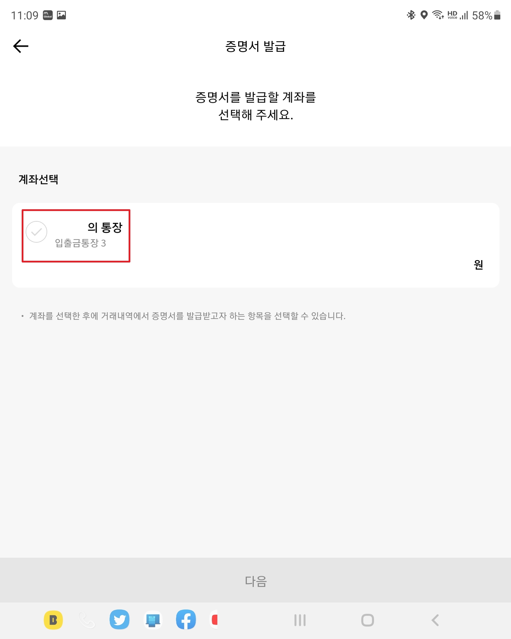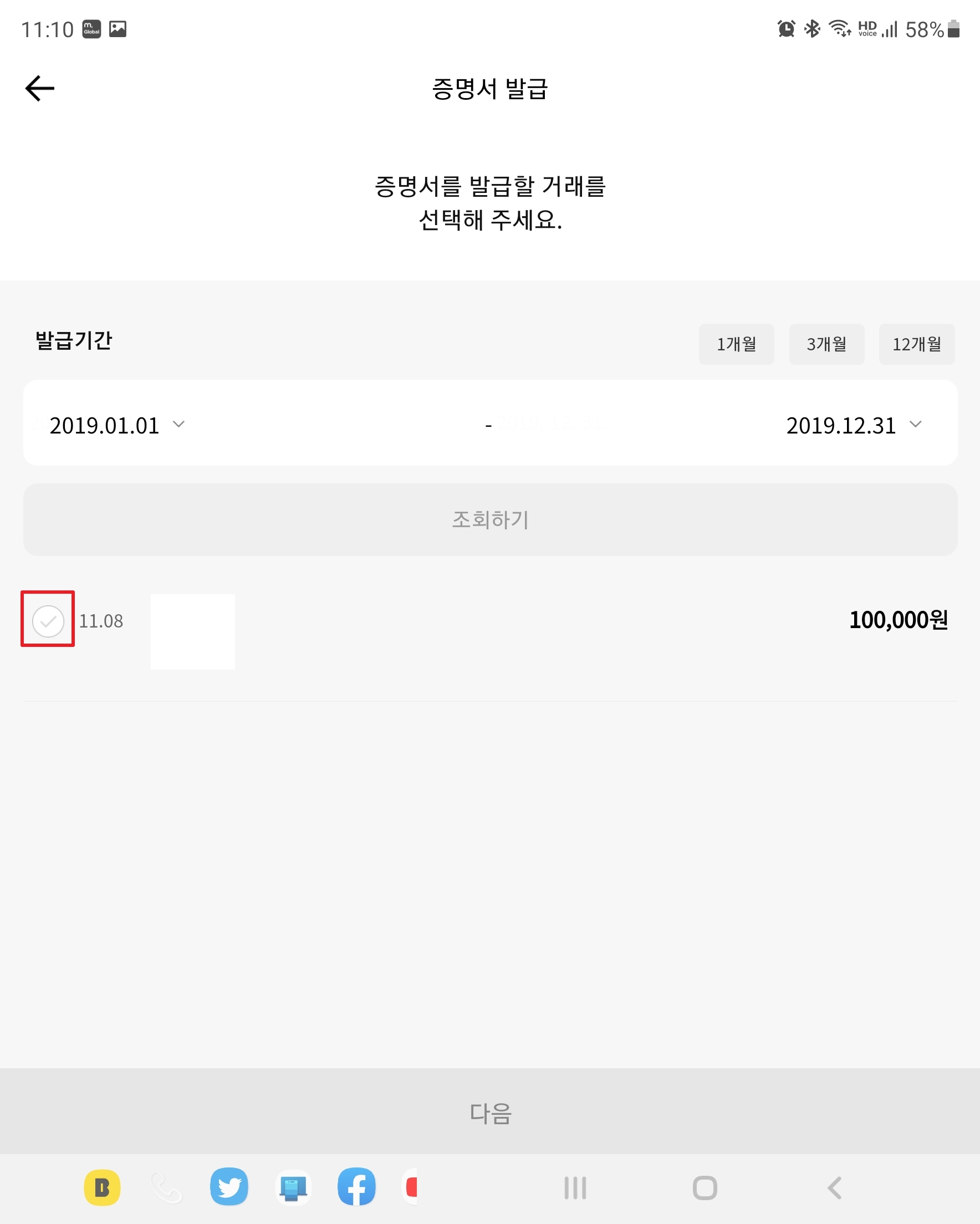 증명서 발급할 거래를 모두 선택하였으면 [다음]을 누릅니다.