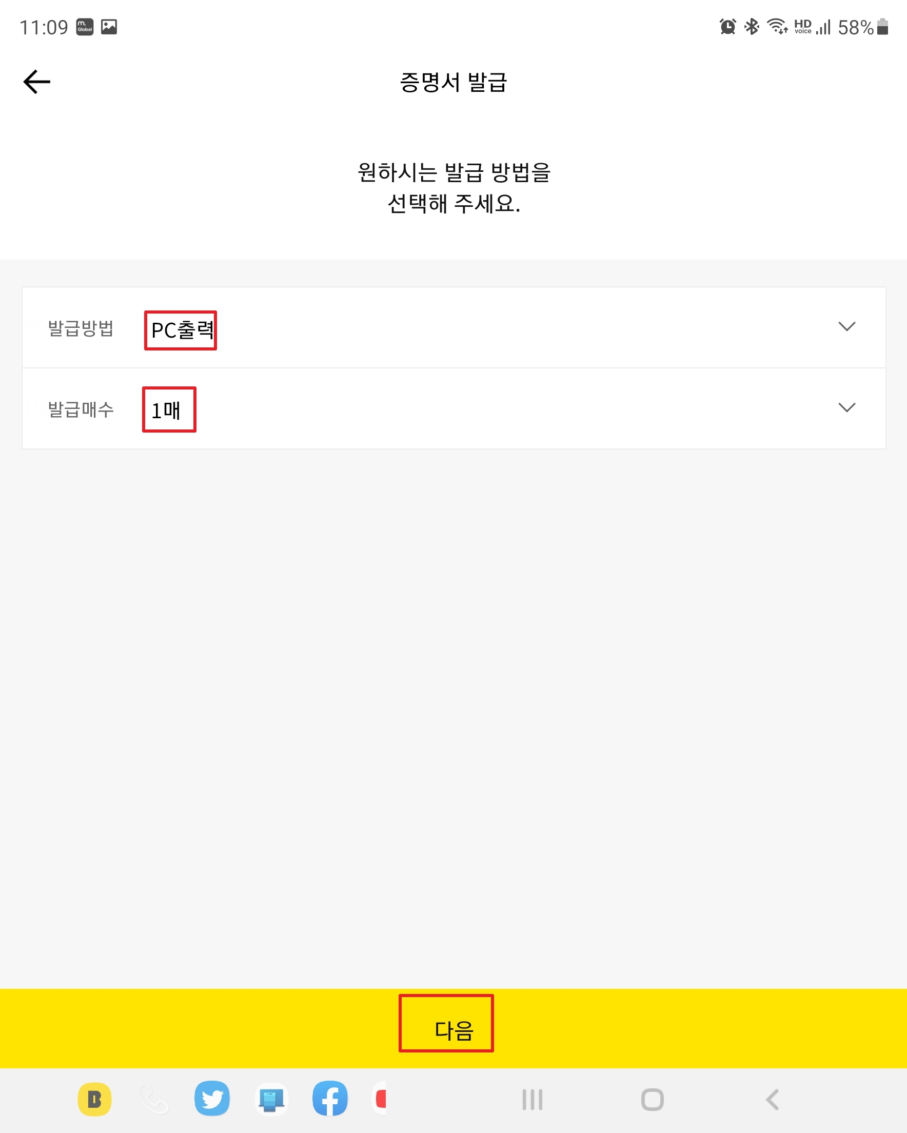 발급방법은 [PC출력], 발급매수는 [1매]를 선택합니다.