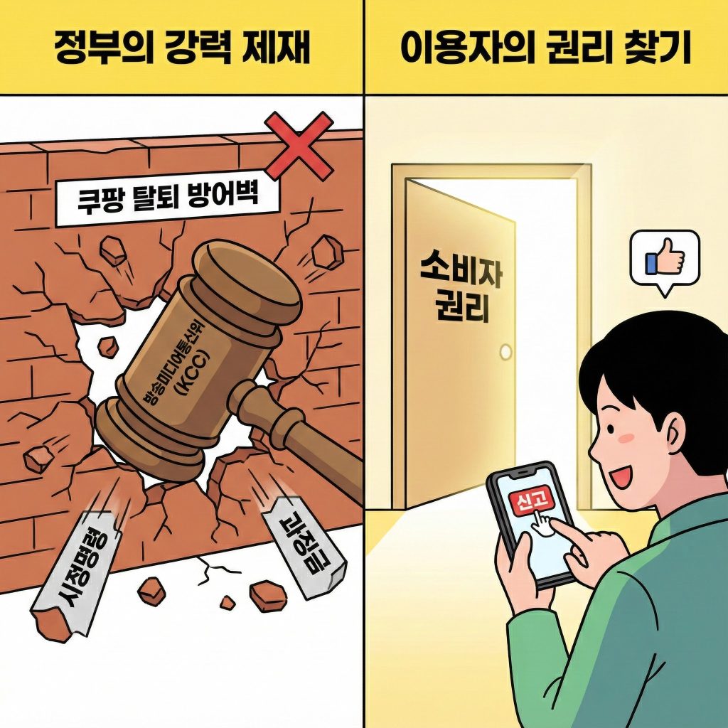 이러한 설계는 이용자의 착각이나 비합리적인 지출을 유도하는 눈속임 상술인 다크 패턴(Dark Pattern) 중, 해지를 의도적으로 방해하는 숨은 갱신 또는 강제적 지속 유형으로 의심됩니다. 이에 방송미디어통신위원회는 쿠팡의 이러한 행위가 이용자의 해지권을 부당하게 제한하는지 확인하기 위해 긴급 사실조사에 착수했습니다.