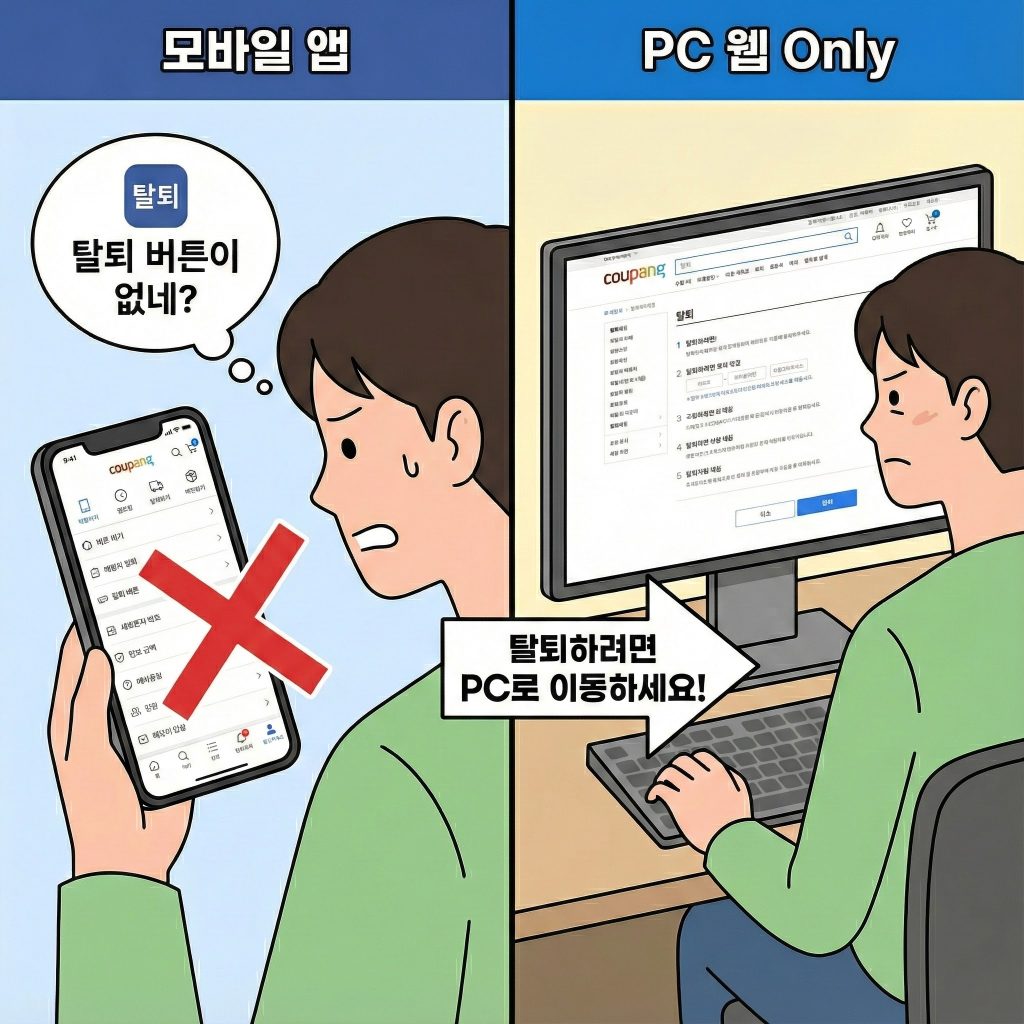 복잡한 동선 설계: PC 웹에서도 마이쿠팡 > 개인정보 확인/수정 > 비밀번호 입력 > 화면 하단 회원탈퇴 클릭 > 비밀번호 재입력 > 이용내역 확인 > 설문조사 등의 복잡한 단계를 거쳐야 합니다.