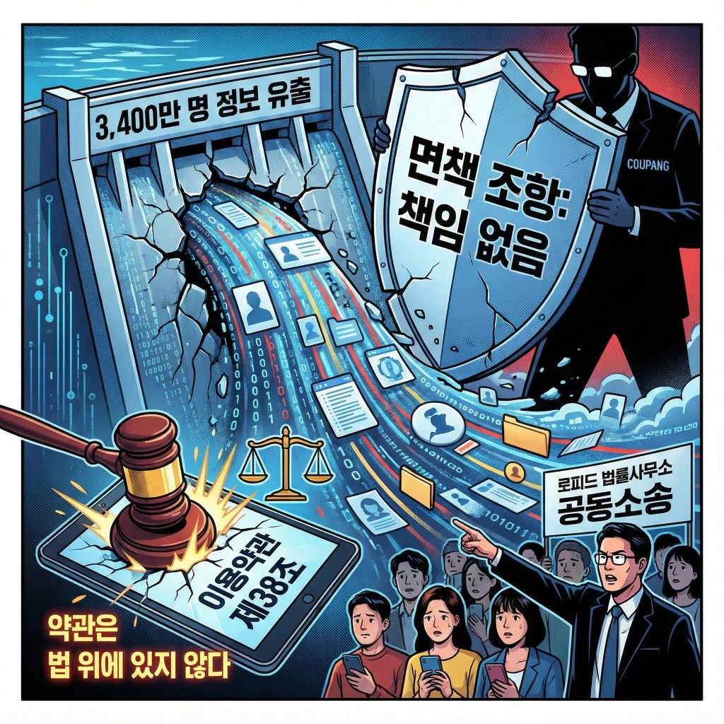 쿠팡과 같은 대형 플랫폼 사업자는 개인정보보호법상 고객 정보를 안전하게 관리할 고도의 주의 의무가 있습니다. 설령 해킹이 제3자에 의한 것이라 해도, 회사의 보안 시스템 미비(과실)가 있었다면 책임을 져야 합니다. 이를 무조건적으로 면책하겠다는 약관은 제7조 위반으로 무효입니다.